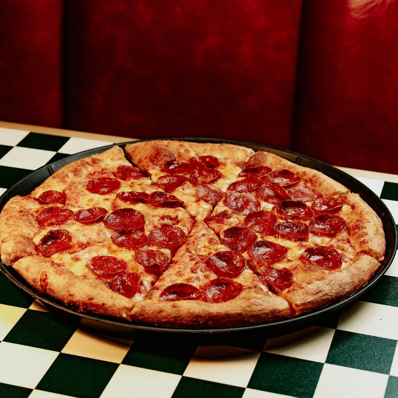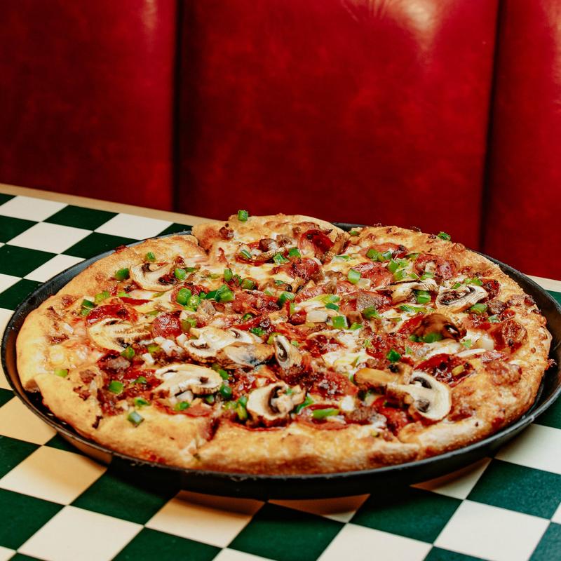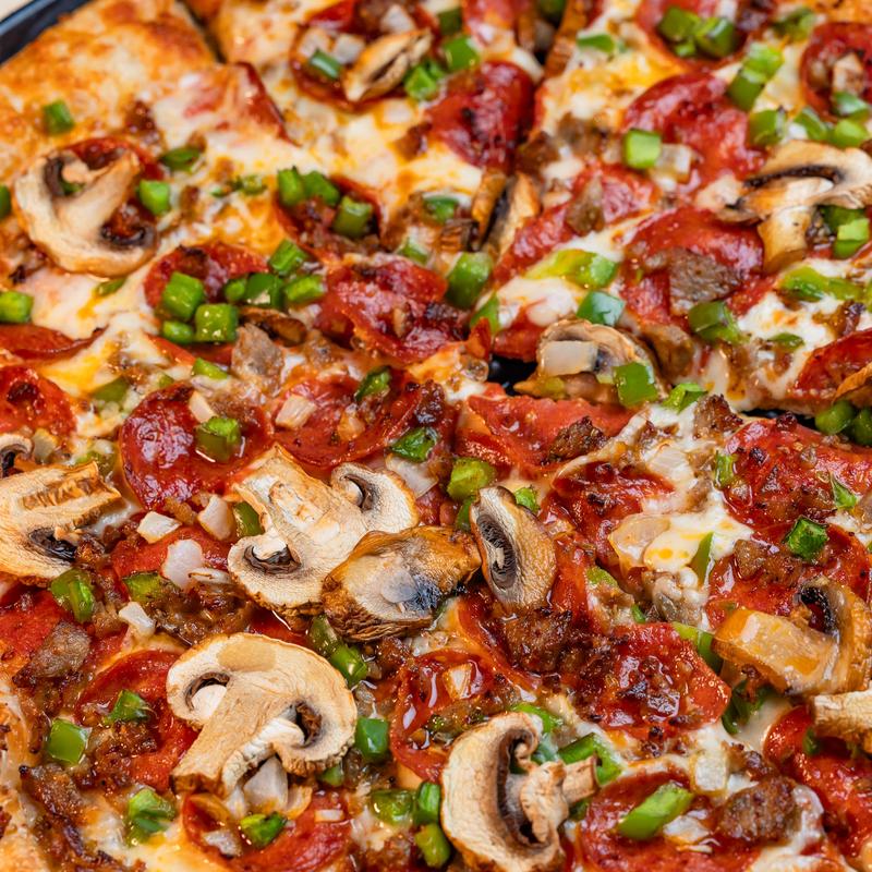 Pizza Sauce • Mozzarella Cheese • Pepperoni • Sausage • Onion • Green Pepper • Mushrooms